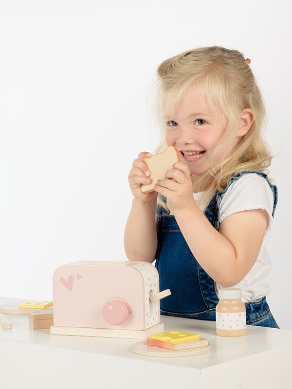 Njammieeee... zin in een heerlijk ontbijt? Met deze houten speelgoedbroodrooster van Label Label in trendy roze/antraciet kleur tovert je kleintje de lekkerste toast. Plaats de sneetjes brood in de gleuven, druk de hendel omlaag en zie hoe de toast omhoog springt! De set is vervaardigd uit FSC-gecertificeerd hout en afgewerkt met kindvriendelijke verf op waterbasis. Inclusief twee houten sneetjes brood, twee bordjes, mesjes, plakjes kaas, botervlootje en potje beleg. Spelenderwijs leert je kind rollen en interactie terwijl oog-handcoördinatie en creativiteit worden gestimuleerd. Perfect voor rollenspel in elke speelkeuken.