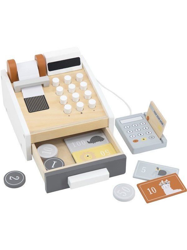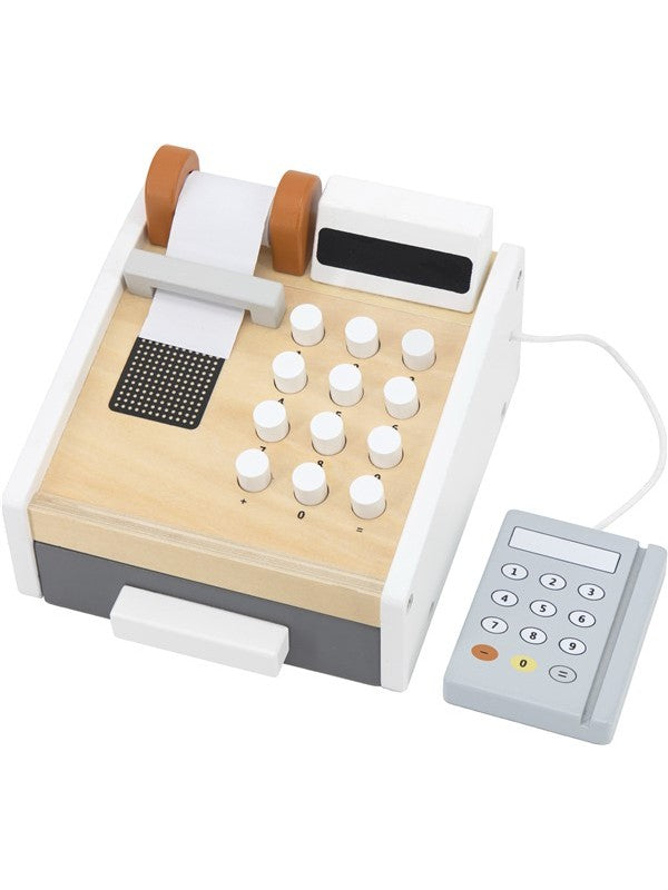 Reken af met speels gemak met de Tryco houten kassa — perfect voor kleine winkeliers in wording! Deze sfeervolle kassa is uitgerust met een functioneel toetsenbord, een krijtbord-scherm, een papieren kassabonrol, een houten pinautomaat én bijpassende pinpas, plus munten en briefgeld in dierlijke print — alles wat winkelende fantasie nodig heeft.